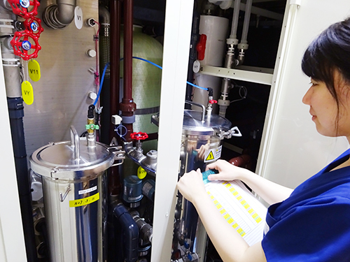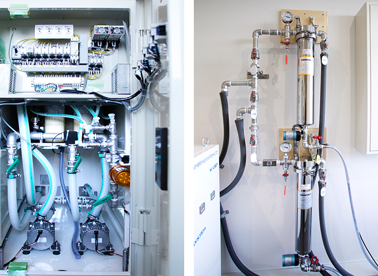 当然のことながら、当クリニックでは、厳正に品質管理した超純水の使用、幾重にも設置した濾過フィルターにより、無菌かつ無毒の透析液を作製しています。また、当クリニックが採用しているPVDF (ポリフッ化ビニリデン) 配管は、不純物や環境ホルモンが一切溶出しないため、薬品工場等の超純水対応配管として使用されているものです。従来の塩化ビニル製配管とは大きく違い、配管内部が高度に鏡面化されており、継ぎ目も無いため、細菌の繁殖抑制に有効です。クリーンかつ高い安全性を兼ね備えたPVDF配管は、理想の透析液配管システムとされています。これらの維持・管理は、専門の臨床工学技士によって行われており、日本臨床工学技士会の定める透析液安全管理責任者セミナーにも参加するなど、さらに質の高い透析液管理を目指しています。